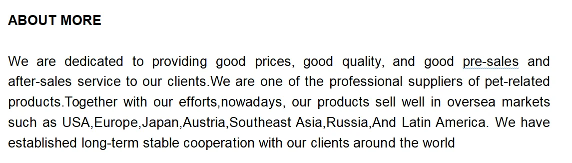 Productos principales:Cochecito para mascotas, caja de arena para gatos, juguetes eléctricos para mascotas, herramientas eléctricas para mascotas, equipo médico para mascotas